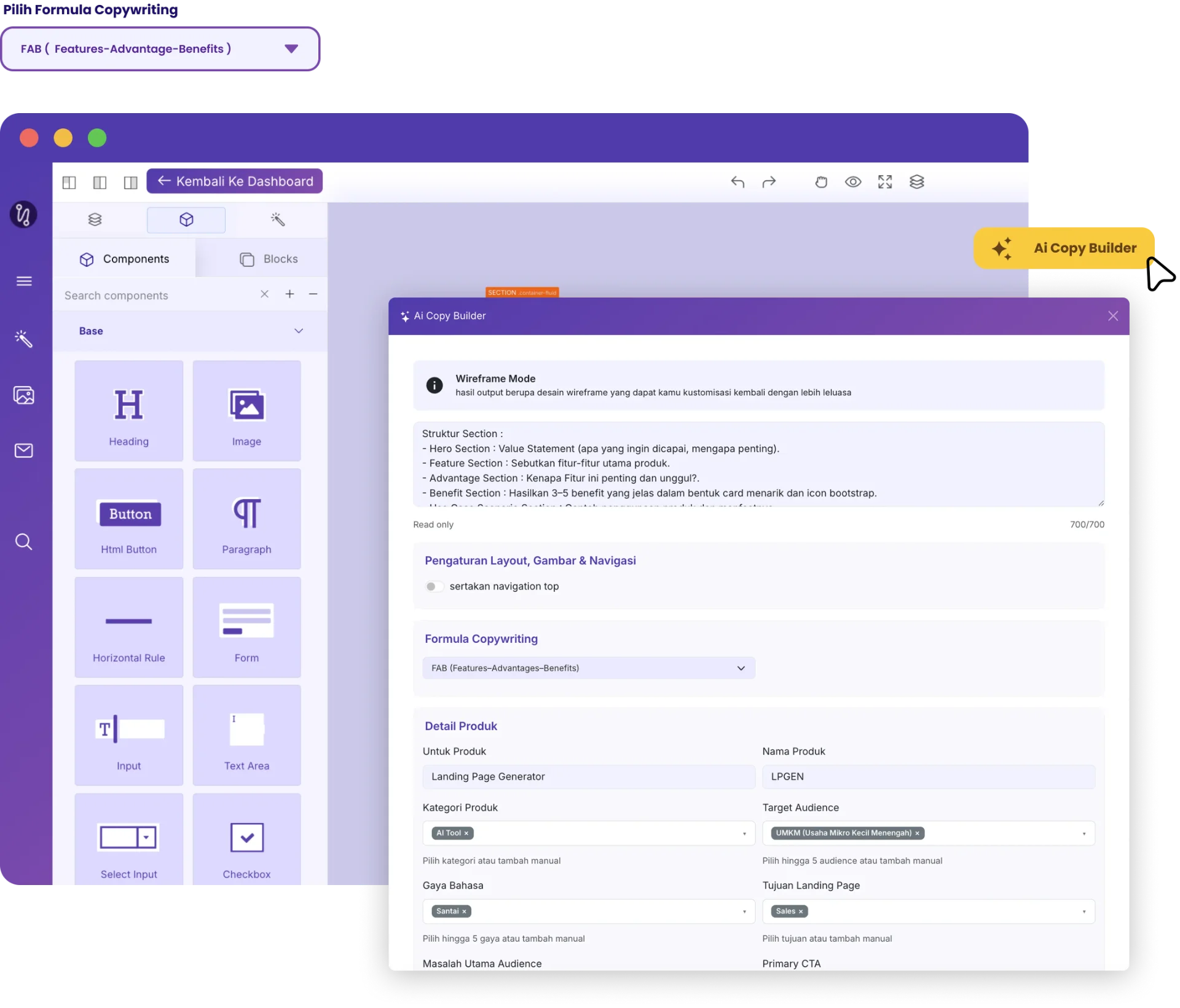 Fitur AI kami membantu menyusun landing page dengan alur copywriting yang rapi + wireframe yang logis,